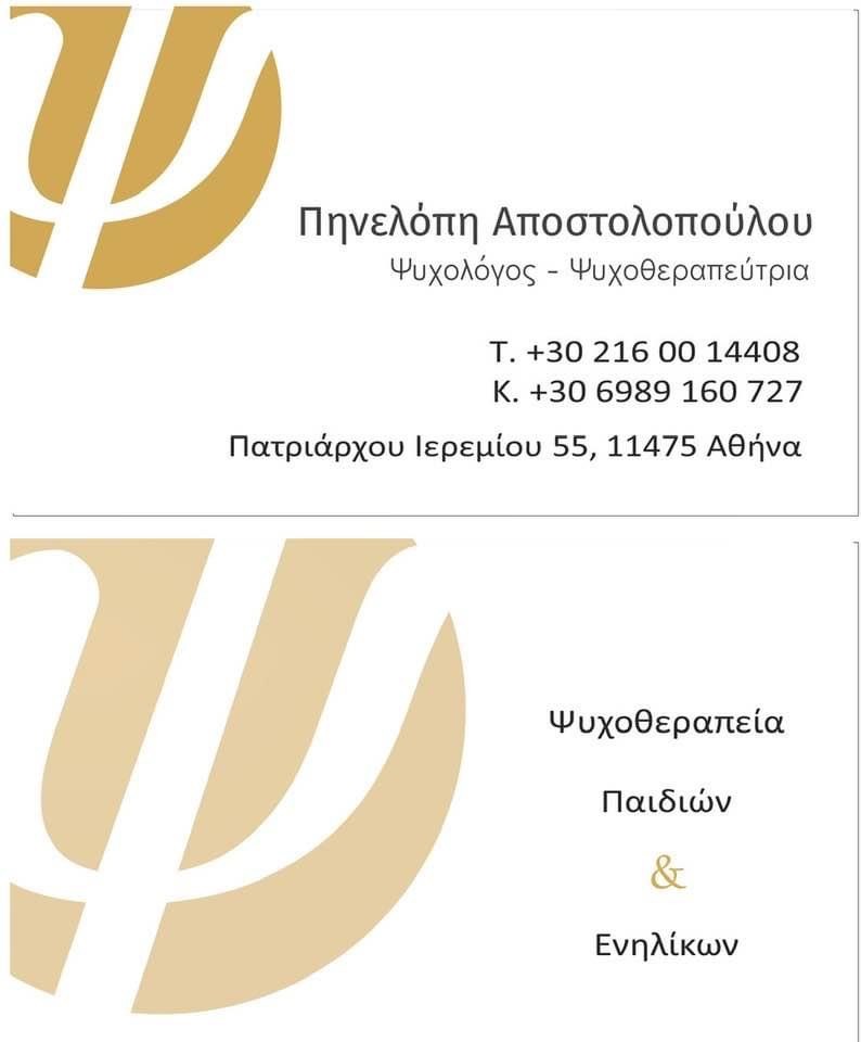 H Πηνελόπη Αποστολοπούλου είναι Ψυχολόγος –Ψυχοθεραπεύτρια με αριθμό άδειας : 2754. Διατηρεί ιδιωτικό γραφείο στου Γκύζη, Αθήνα. Είναι πτυχιούχος Ψυχολογίας από το University of Derby στην Αγγλία και κάτοχος MSc (Hons) Παιδοψυχολογίας από το University of Central Lancaster, εκπαιδεύτηκε στη Γνωσιακή -Συμπεριφορική Ψυχοθεραπεία Παιδιών, Εφήβων και Ενηλίκων στο Κέντρο Εφαρμοσμένης Ψυχοθεραπείας και Συμβουλευτικής .Εργάζεται ως εξωτερικός συνεργάτης σε κέντρα ειδικών θεραπειών και σε σχολείο. Έχει παρακολουθήσει πλήθος μετεκπαιδευτικών σεμιναρίων σχετιζόμενα με το επιστημονικό της πεδίο.