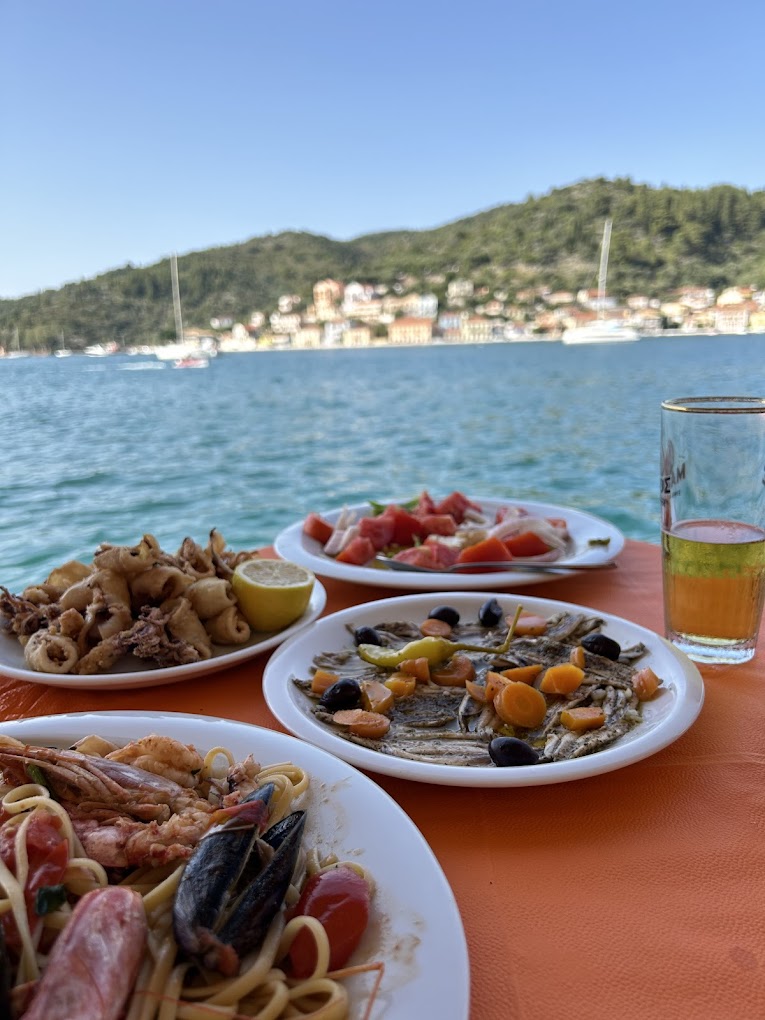 Φρέσκα ψάρια και ποιότητα. Δίπλα στο κύμα, θαλασσινά και σαλάτες.